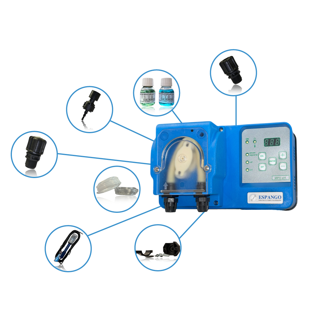 La pompa viene fornita con un kit di installazione che include tutto il necessario per il montaggio, tubi e valvole di ricambio e una sonda pH con soluzione pH 7 per una taratura ottimale.